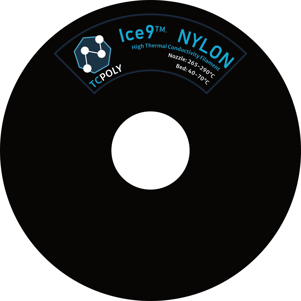 Ice9 Nylon is a polyamide-based thermally conductive filament with temperature stability above 150°C. It is not electrically conductive but has a thermal conductivity of 4 W/m-K in the print direction. It works well with most standard FDM printers (with nozzles that can achieve at least 270°C print temperature). Ice9 Nylon is ideal for applications that require high-temperature stability and thermal conductivity, such as heat sinks, cooling fins, and other heat dissipation components.
